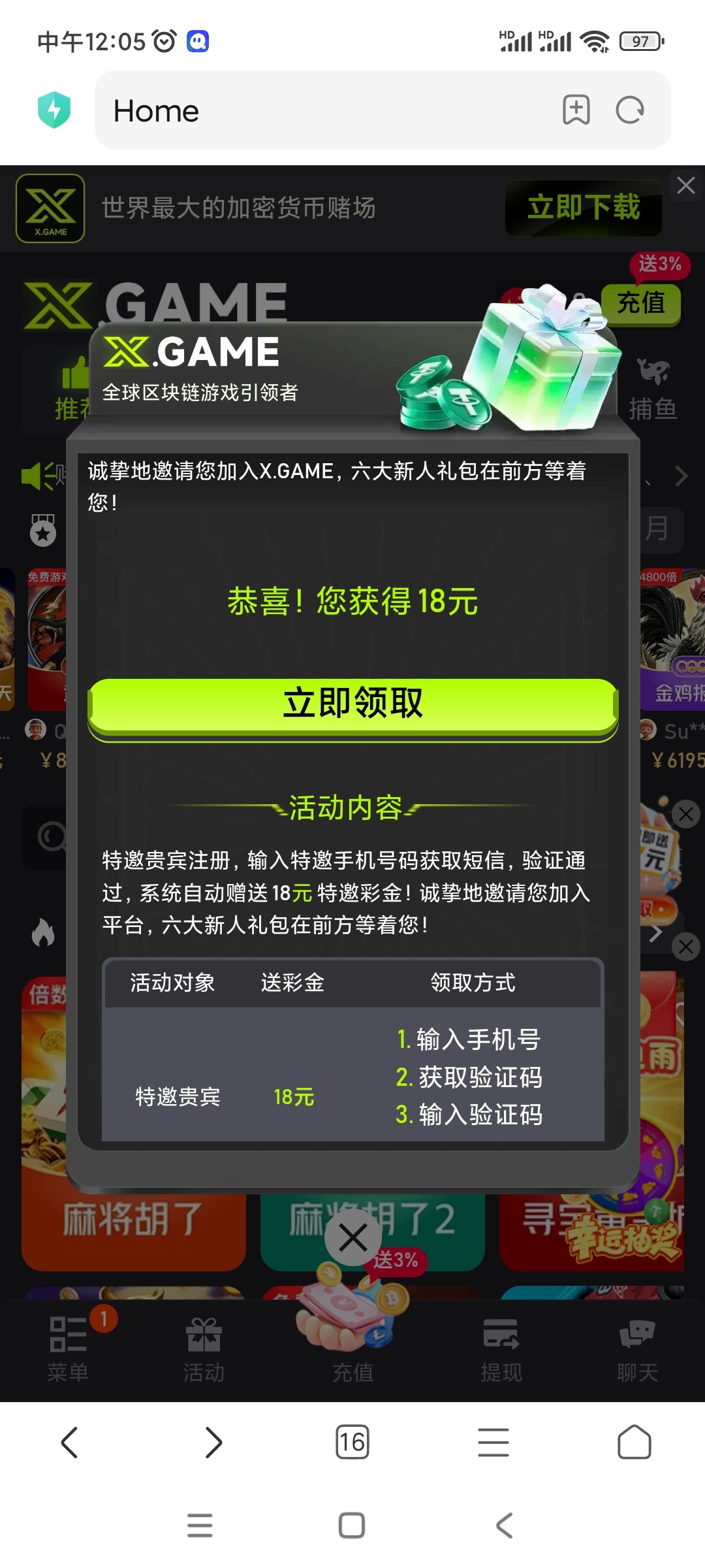 X.G登录弹窗领18彩金