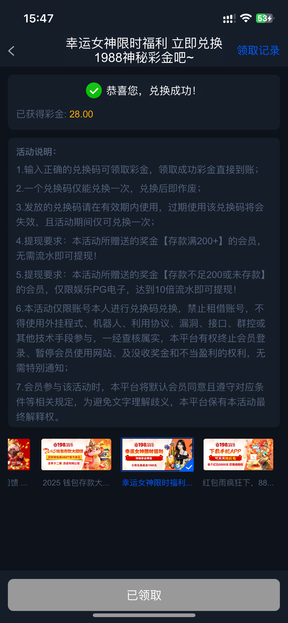 网址:198.cc充值过的去试试,我领的两个还剩一个,KF9v55uCy0We