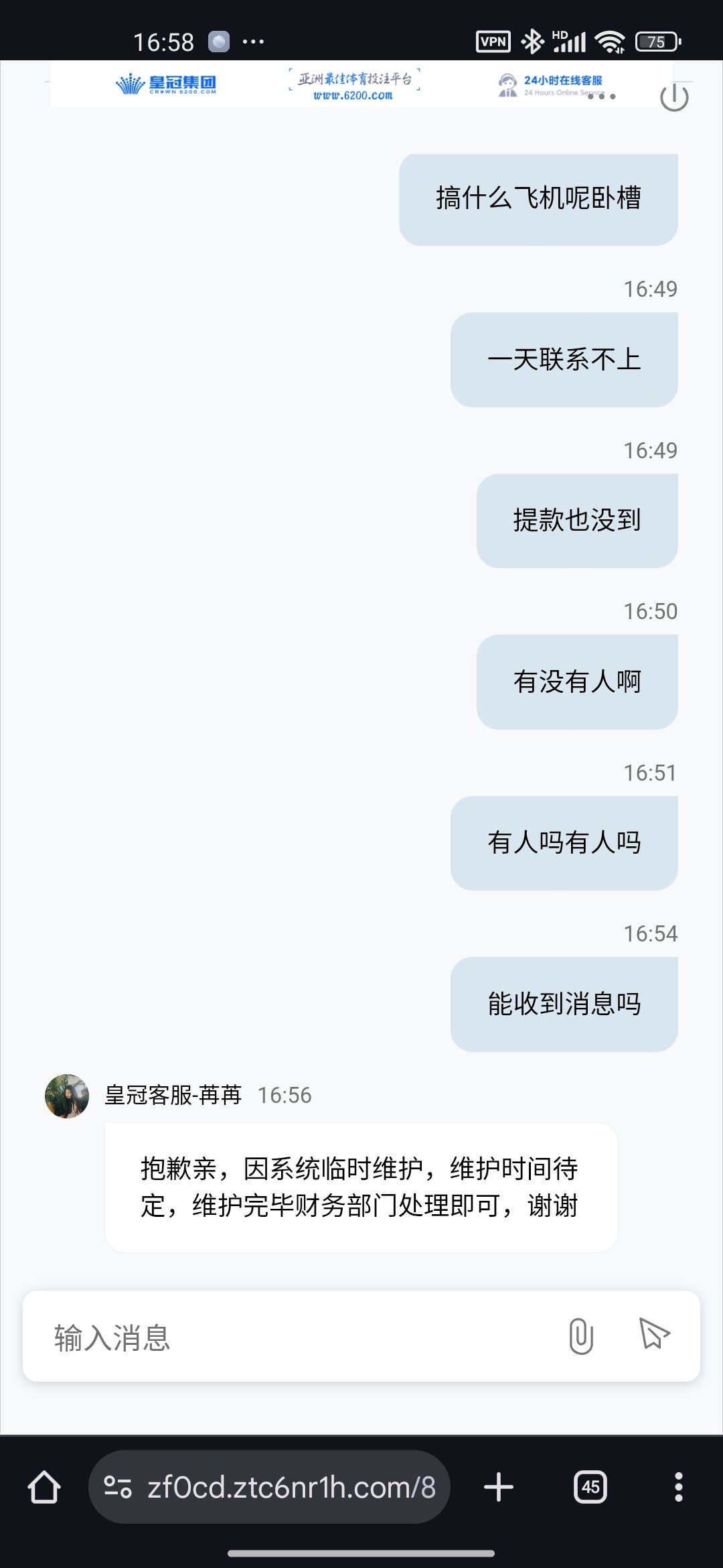 台子是6200皇冠集团,在这台玩了一年多了,昨天提现还秒到,凌晨提了一笔现在都没到。现在客服已经找不到了,在线客服一直都是留言状态,tg客服上线时间定格在昨晚十点半。昨天提还是秒到,今天台子所有人就失踪,是被条子端了?