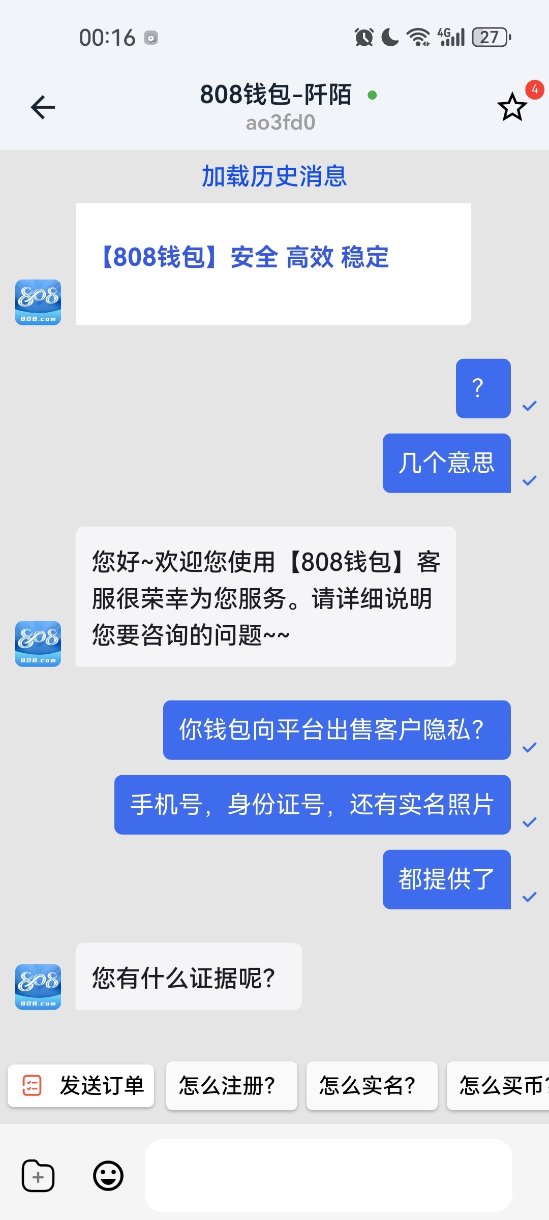 由于害怕安盈彩票APP会盗取相册,未截图就已删除,现提供808钱包客服的精彩语录——您有什么证据呢?