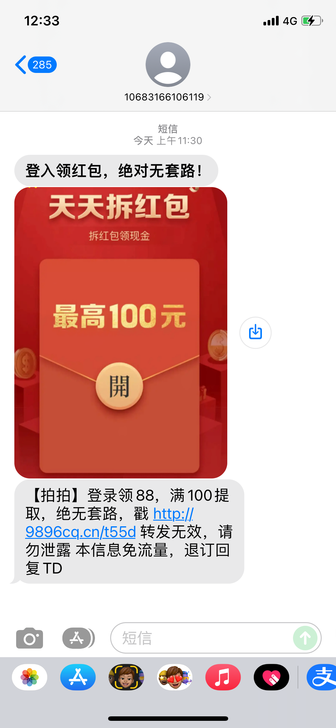 这种类型短信我收到很多,跳转不了,我直接删了